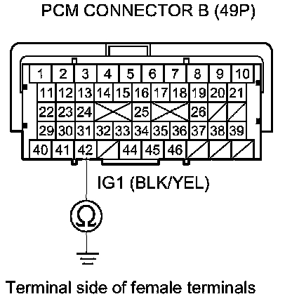 43. Check for continuity between PGM-FI main relay 1 4P connector terminal No. 2 and body ground.