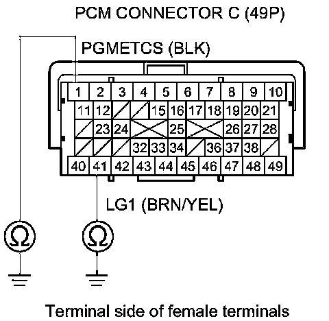 71. Check for continuity between body ground and PCM connector terminals A41, B1, B40, B41, C1, and C41 individually.