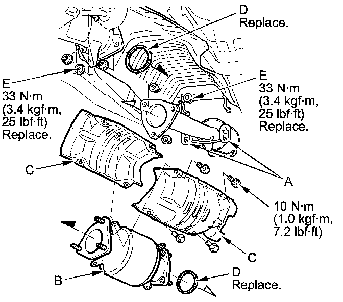 5. Install the parts in the reverse order of removal with new gaskets (D) and new self-locking nuts (E).