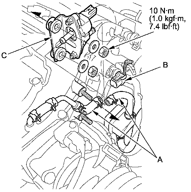 1. Disconnect the hoses (A) and the EVAP canister purge valve 2P connector (B).