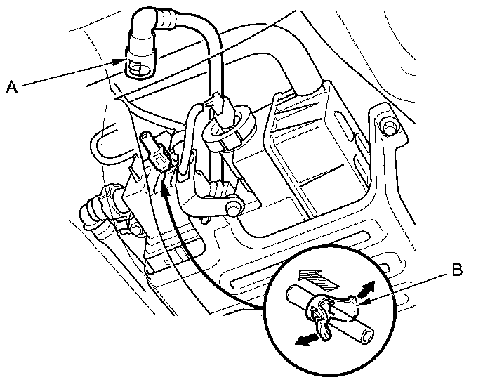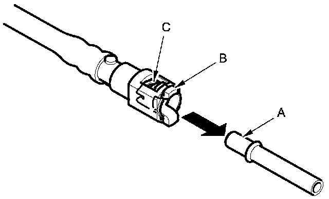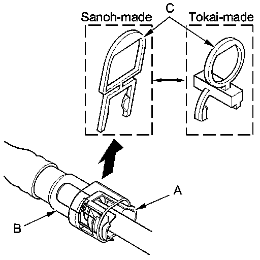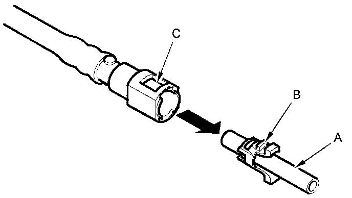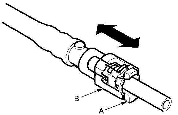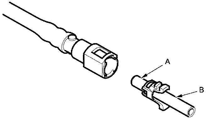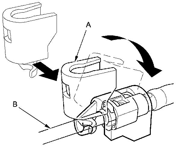 2. Insert a new retainer (A) into the connector (B) if the retainer is damaged, or after: