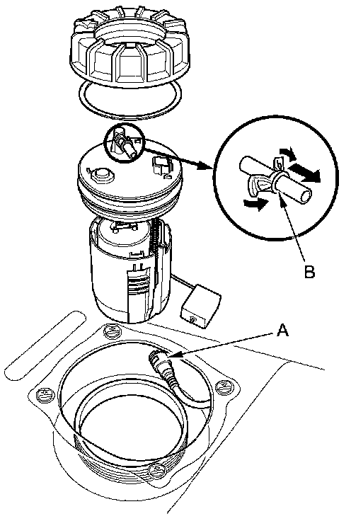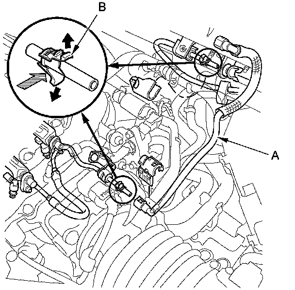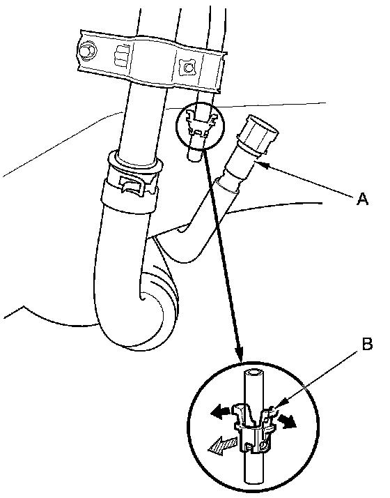 3. Before connecting a new fuel line/quick-connect fitting assembly (A), remove the old retainer (B) from the mating line.