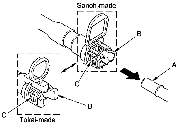 5. When you reconnect the connector with the old retainer, make sure the connection is secure and the tabs (A) are firmly locked into place; check visually and also by pulling the connector (B). When you replace the fuel line with a new one, make sure you remove the ring pull (C) upwards after you confirm the connection is secure.