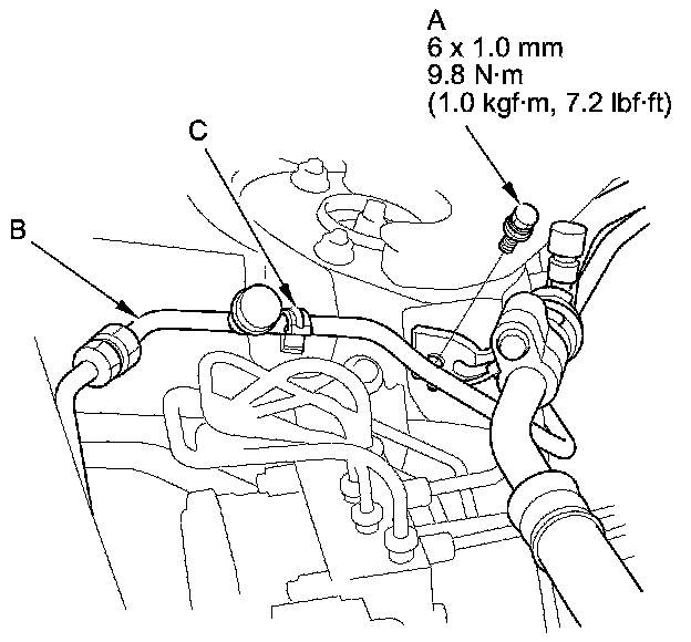 5. Disconnect the VSA modulator-control unit 47P connector (A) by pushing the lock (B) and pulling down the lever (C); the connector disconnects itself.
