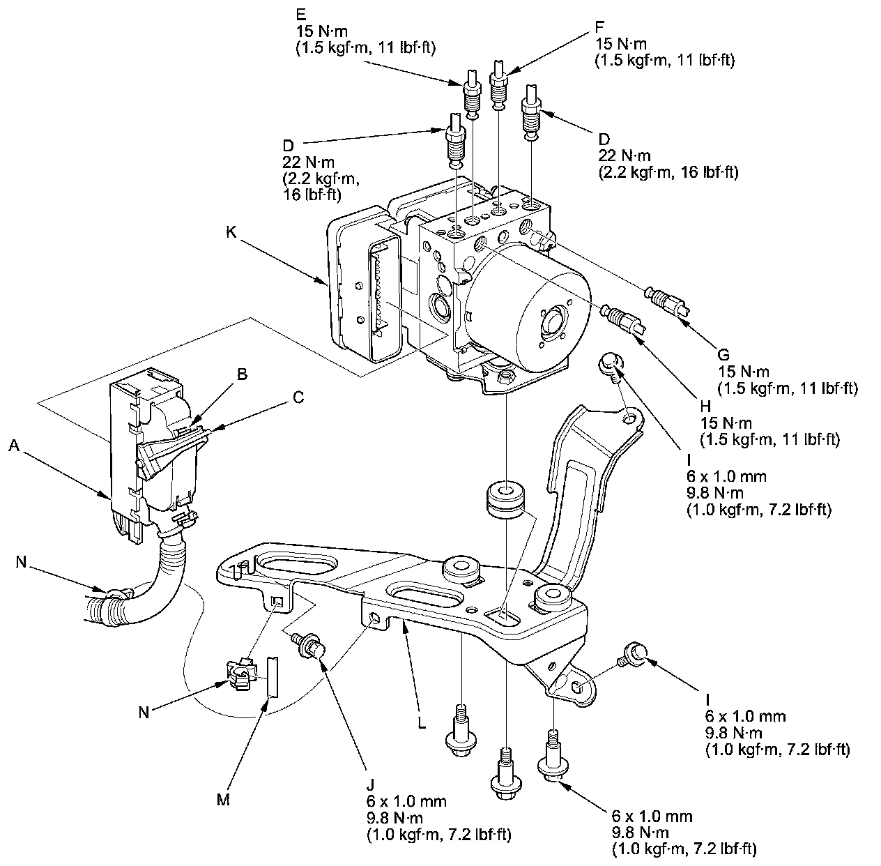 7. Remove the 6 x 12 mm flange bolts (I) and 6 x 16 mm flange bolt (J), then remove the VSA modulator-control unit (K) with the bracket (L) from the body.