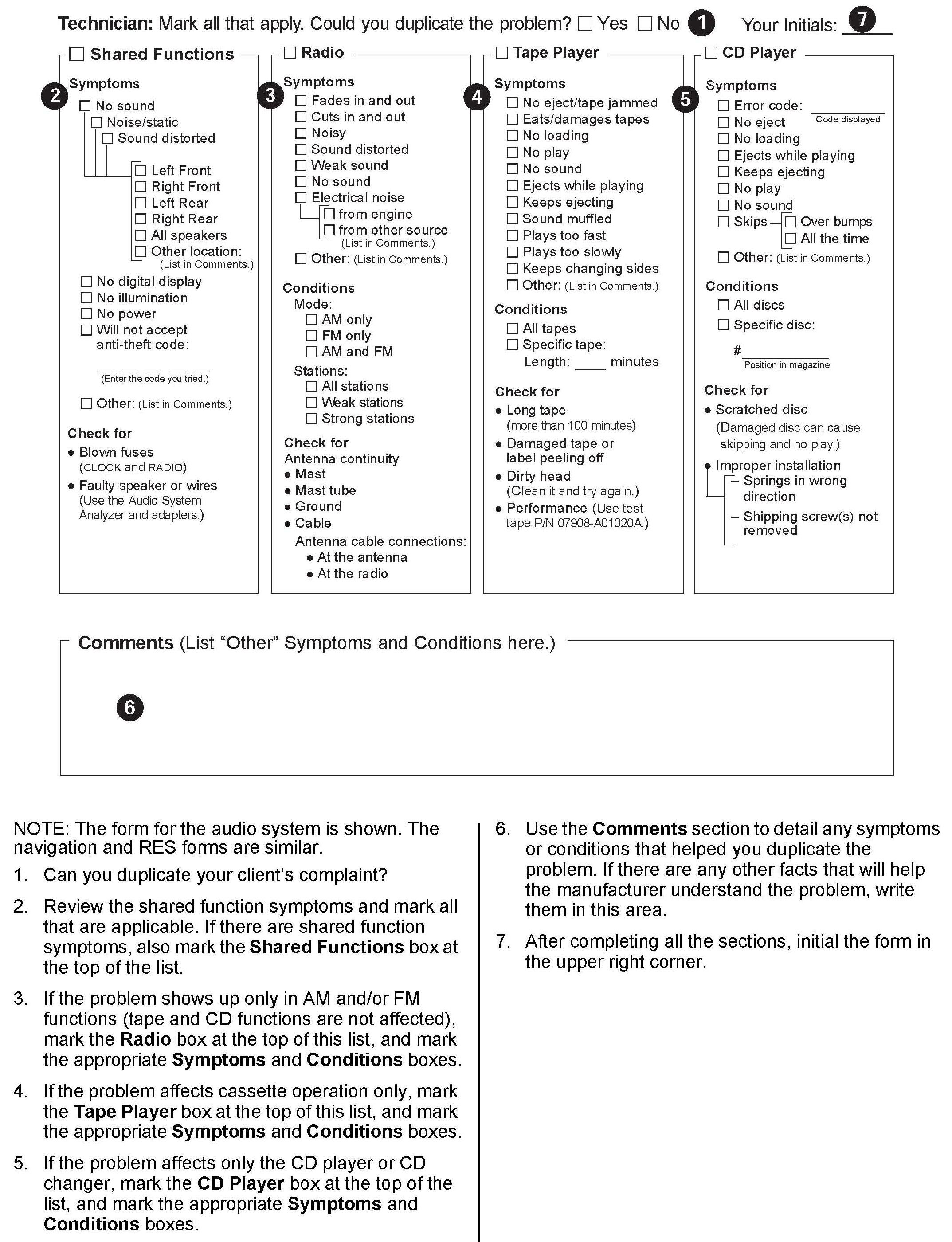 1. Interview the client to get as much information as possible, such as where and when the problem occurs. This information is vital in helping you determine if the audio, navigation, or RES system is operating normally or if a problem exists. Write the complaint on the repair order.