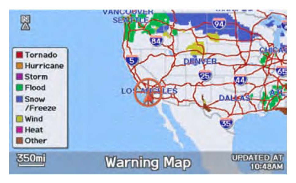 You can also see weather warnings and a weather radar image map. To see weather warnings, say or select Warning Map. The display changes to show weather warnings for the selected area.