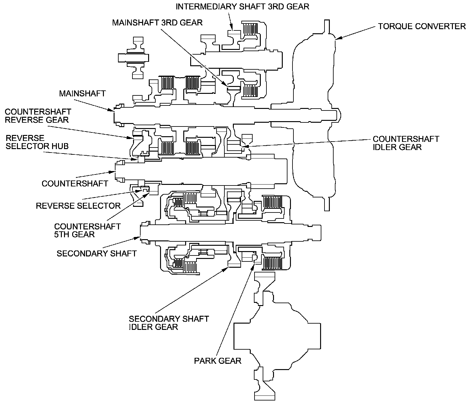 - When shifted from R, the reverse selector engages with the countershaft reverse gear and the reverse selector hub, and the reverse gear engages with the countershaft.