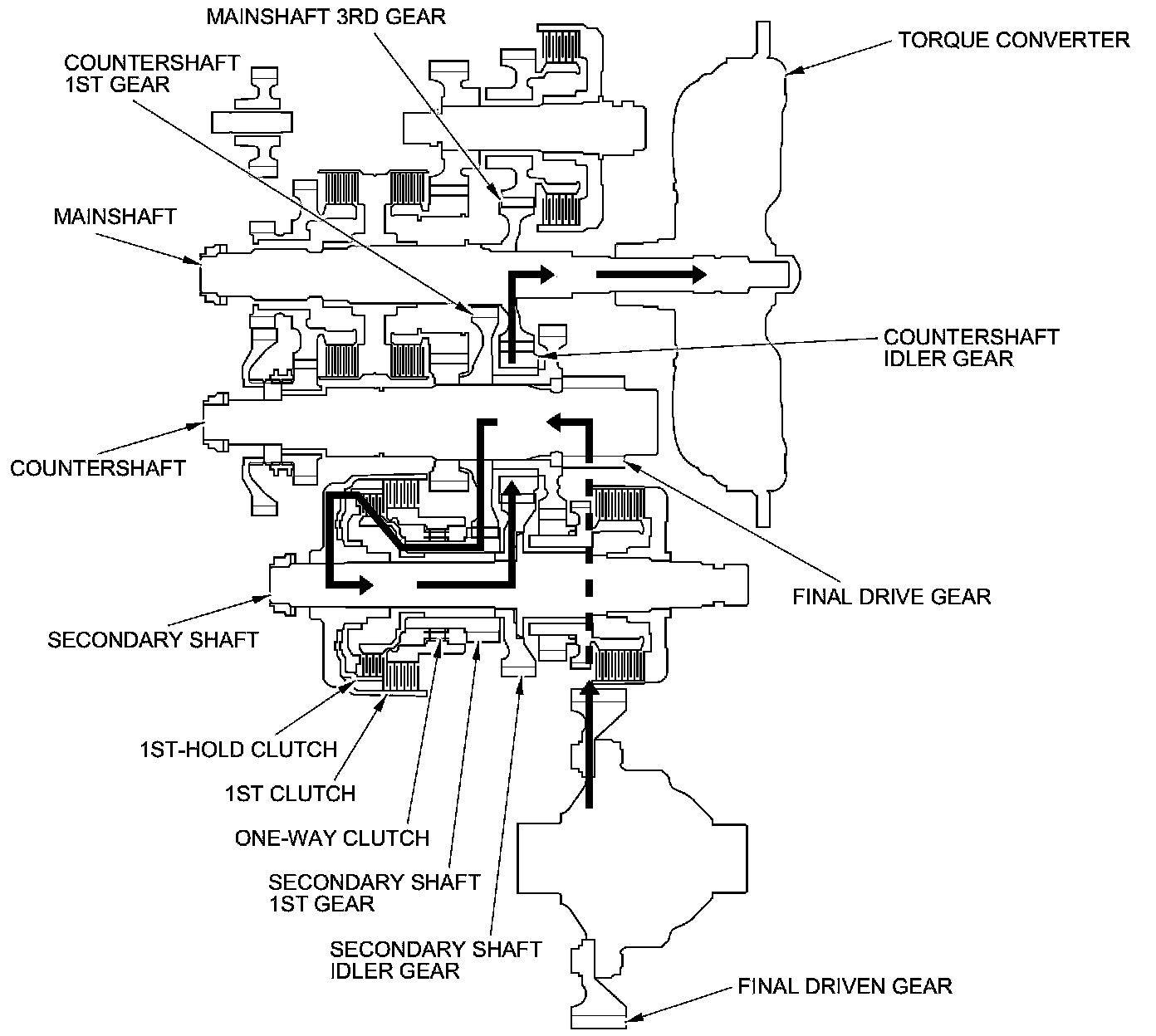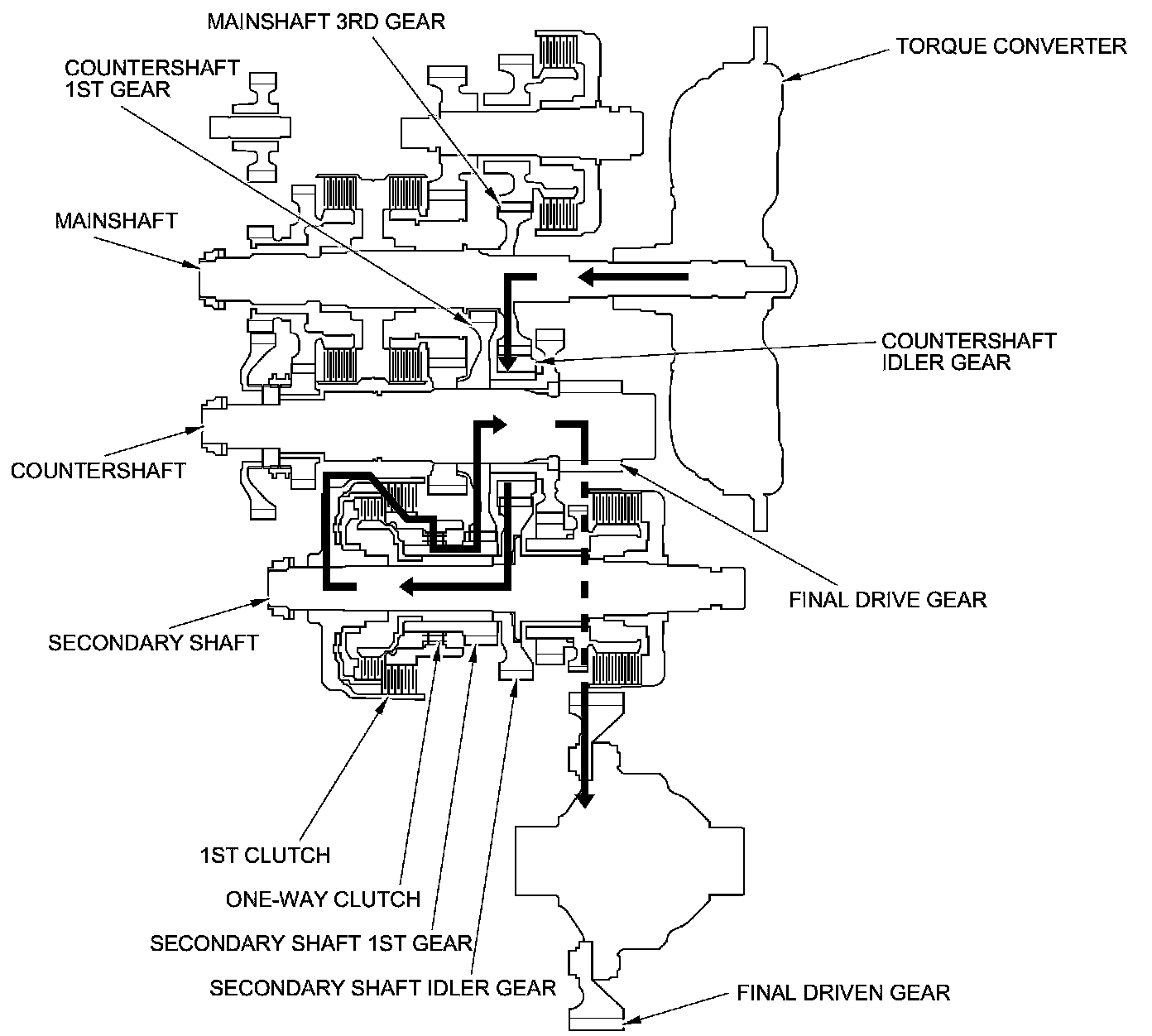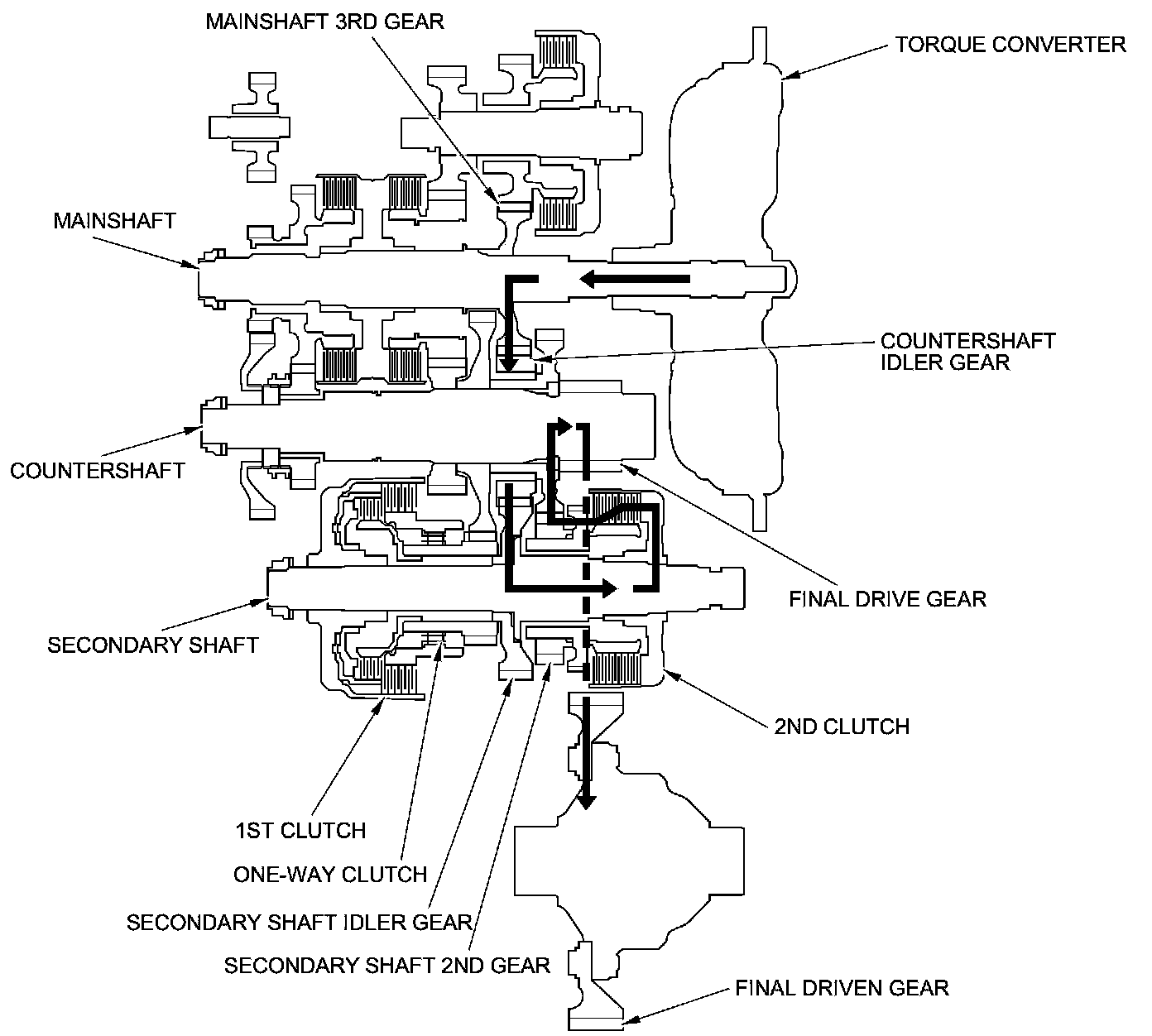 - Hydraulic pressure is applied to the 1st clutch, then the 1st clutch engages the secondary shaft 1st gear with the secondary shaft by the one-way clutch.