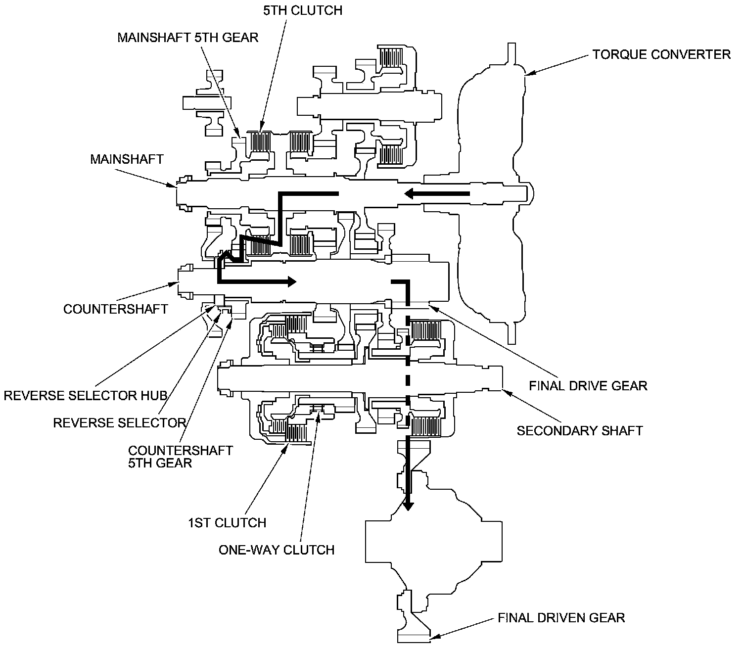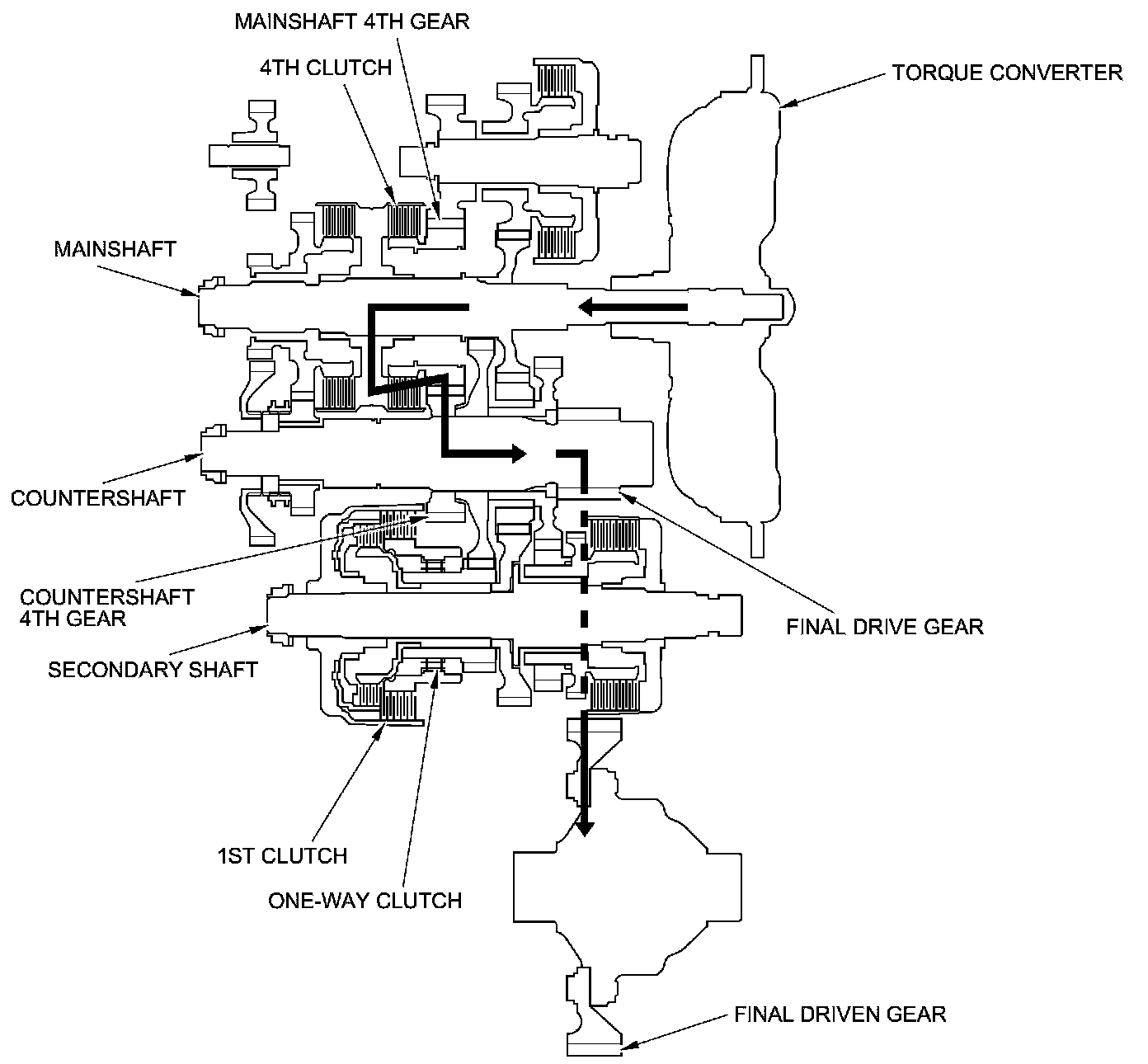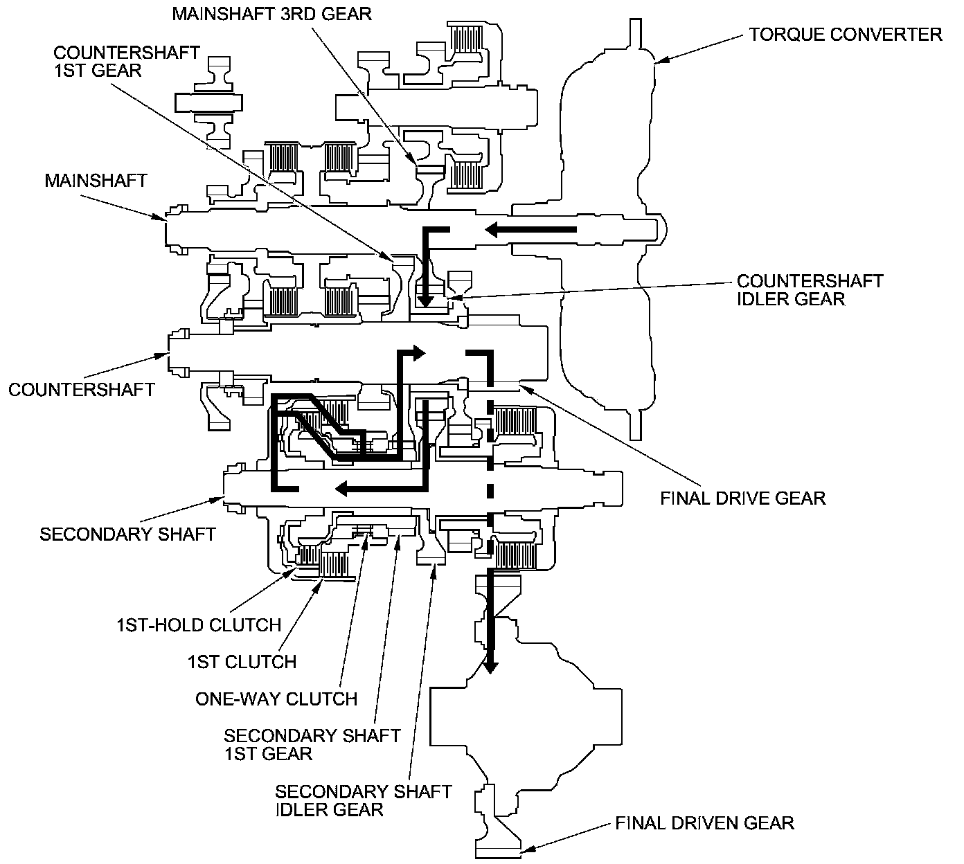 - Hydraulic pressure is applied to the 1st clutch, then the 1st clutch engages the secondary shaft 1st gear with the secondary shaft by the one-way clutch.