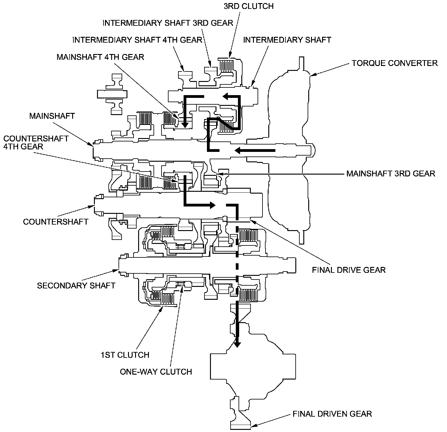 - Hydraulic pressure is applied to the 3rd clutch, then the 3rd clutch engages the intermediary shaft 3rd gear with the intermediary shaft.