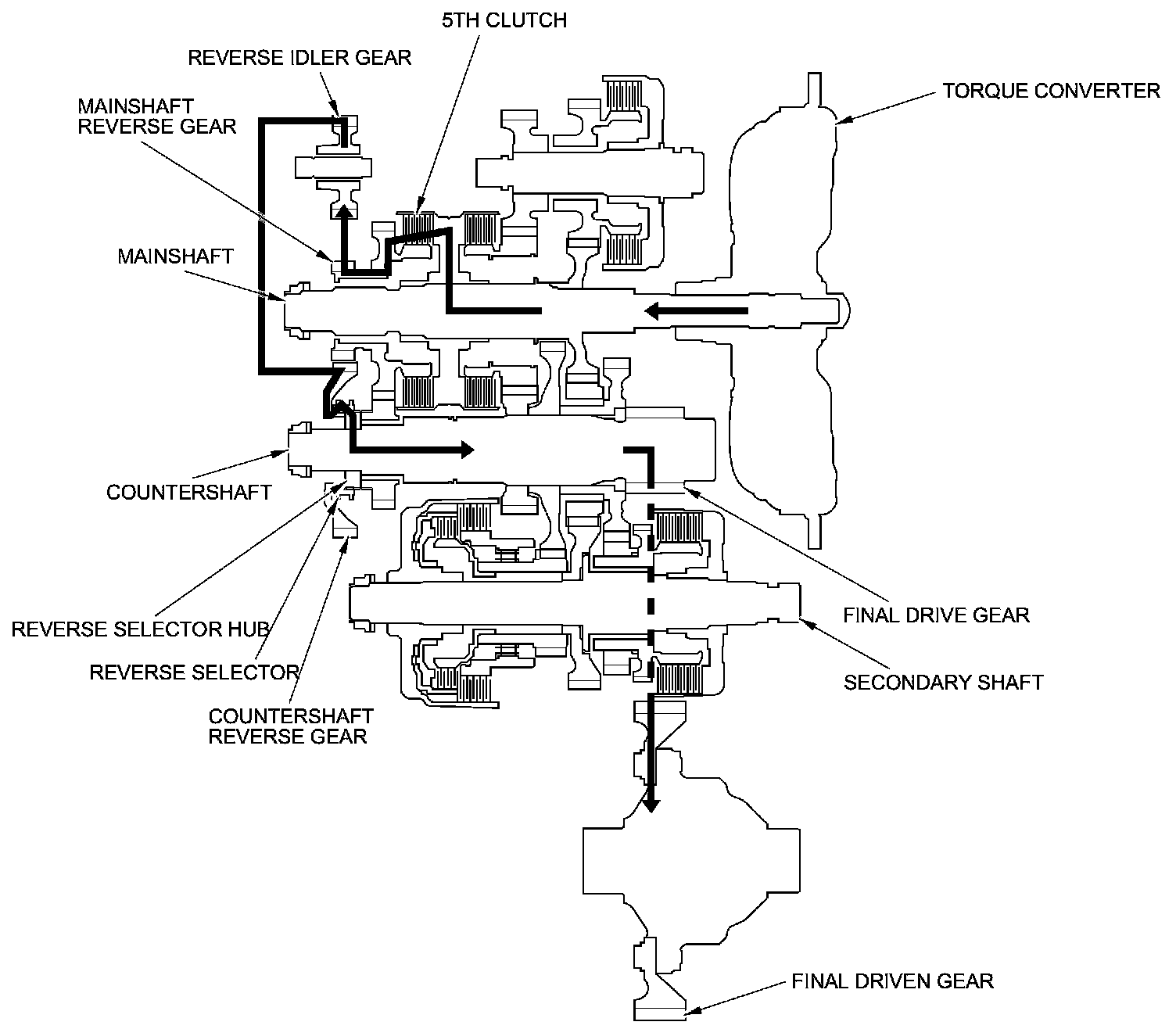 - Hydraulic pressure is applied to the 5th clutch, then the 5th clutch engages the mainshaft reverse gear with the mainshaft.