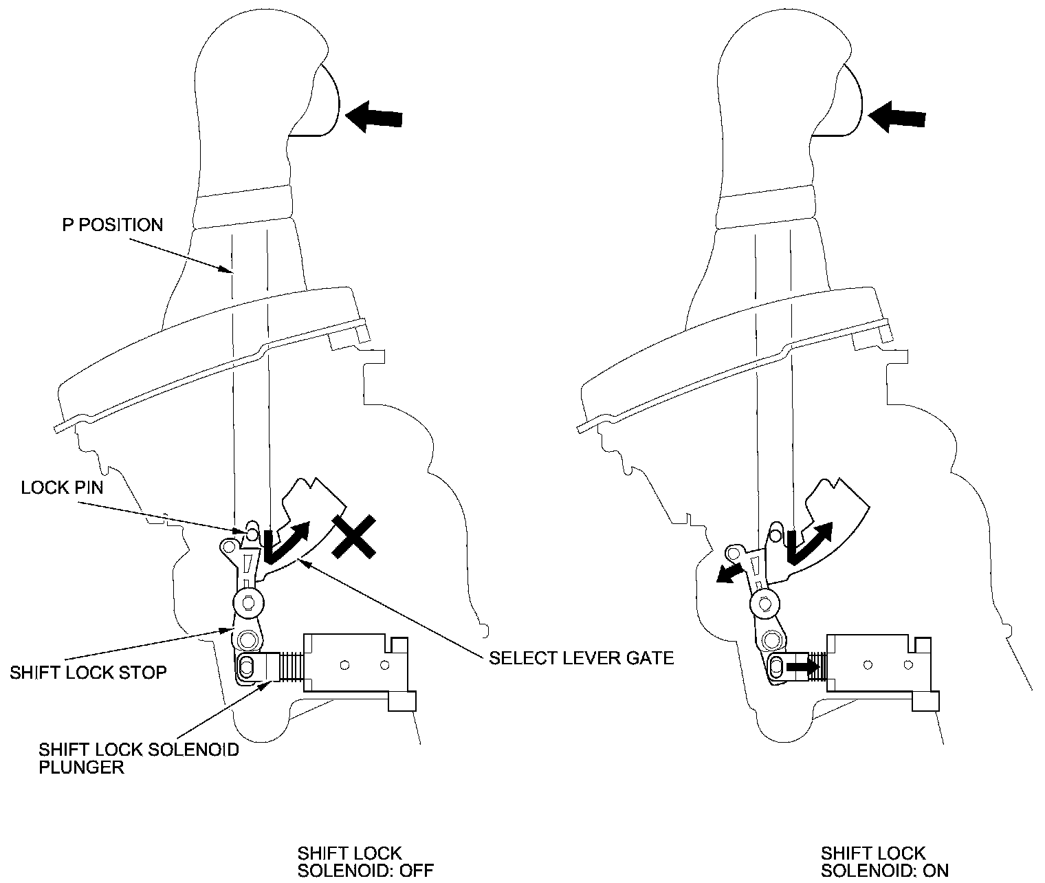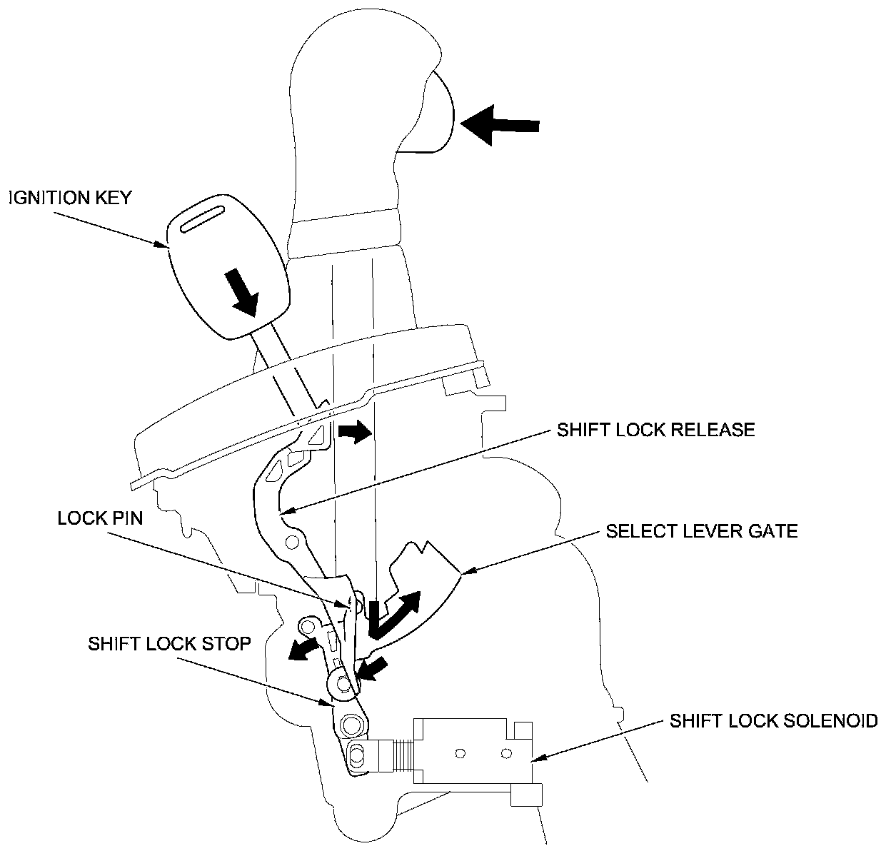 The shift lock system prevents the shift lever from moving unless certain conditions are met. The shift lock solenoid is normally OFF. After starting the engine in P, the shift lever cannot move to any other position because the shift lock stop stops the lock pin. When the brake pedal is pressed and the accelerator pedal is not pressed, the PCM commands the shift lock solenoid is ON; the shift lock solenoid plunger pulls the shift lock stop to release the lock pin. Pressing the shift lever button allows the shift lever to move to any other position. When the brake pedal and the accelerator pedal are pressed at the same time, the PCM commands the solenoid OFF and the shift lock system is locked.