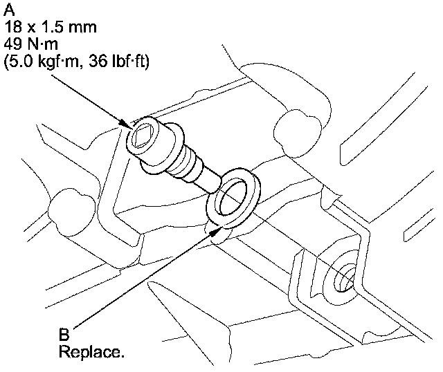 4. Reinstall the drain plug with a new sealing washer (B).