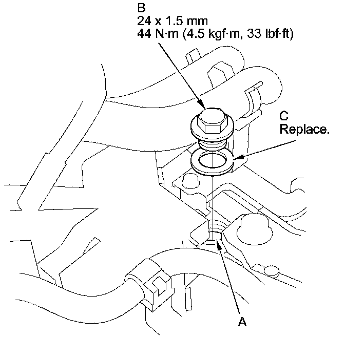 6. Install the ATF filler bolt (B) with a new sealing washer (C).