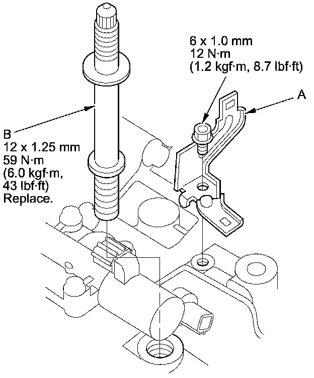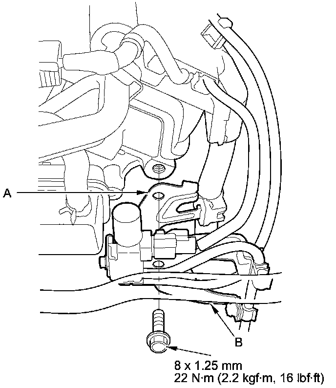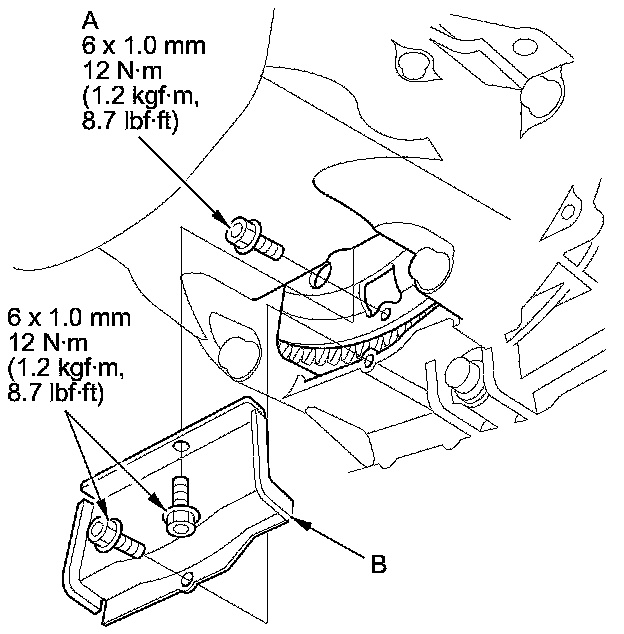 53. Install the harness clamp bracket (A), and the engine mount control solenoid valve bracket (B) to the rear cylinder head.