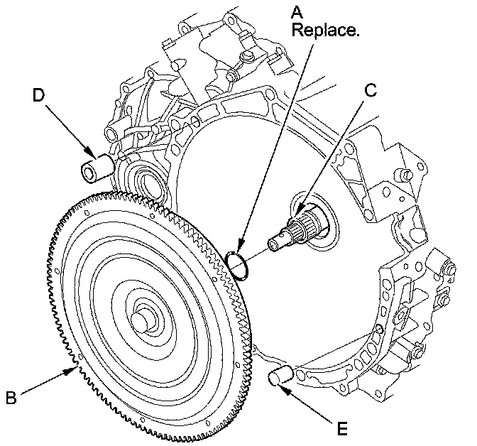 6. Install the 14 x 20 mm dowel pin (D) and the 10 x 20 mm dowel pin (E) in the torque converter housing.