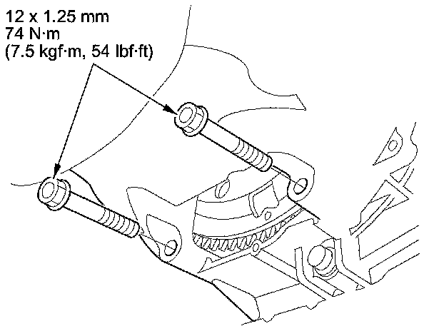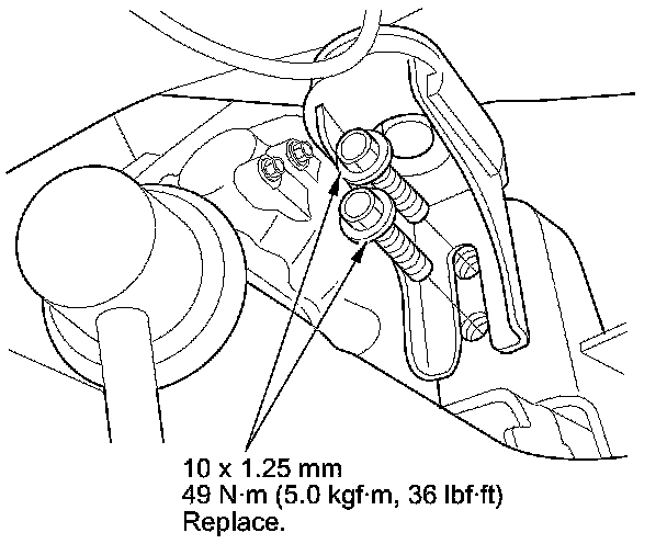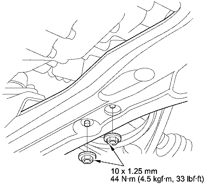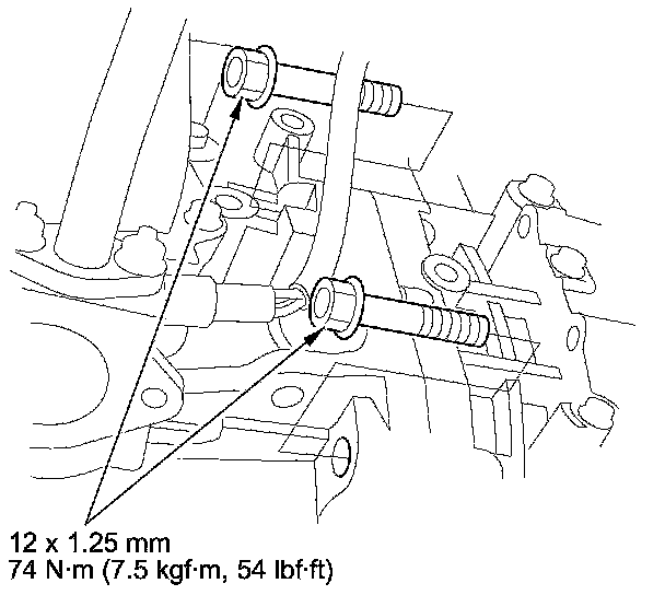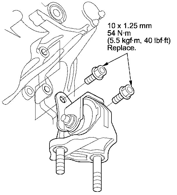 50. Tighten the upper transmission mount bolts to 54 Nm (5.5 kg-m, 40 lb-ft), then tighten the upper transmission mount bracket bolts and nut to 59 Nm (6.0 kg-m, 43 lb-ft).