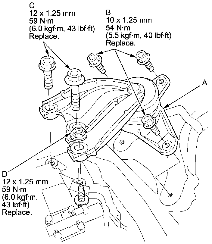 48. Install a new front engine mount bolt (A), then install the front engine mount stop (B) and the clamp bracket (C) with new nuts (D).