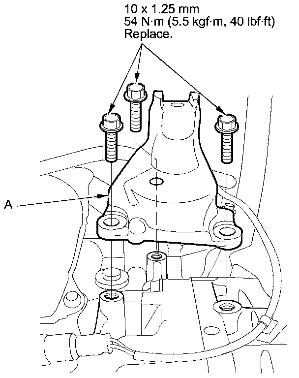 15. Install the front engine mount bracket (A) with new bolts.