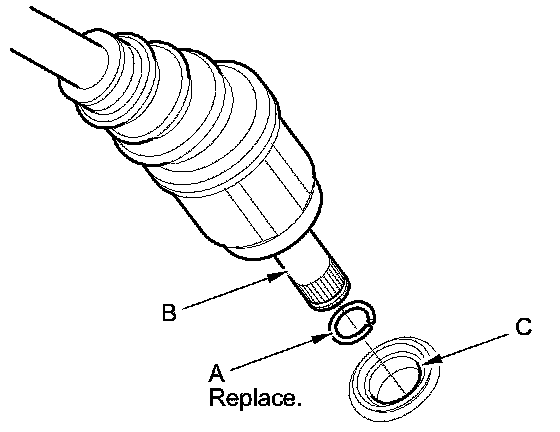 17. Install a new set ring (A) on the intermediate shaft (B). Apply ATF to the intermediate shaft splines (C), then install the intermediate shaft. Be sure not to allow dust or other foreign particles to enter the transmission.