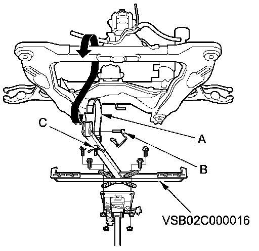 26. Raise the front subframe up to the body, then loosely install new front subframe mounting bolts (A), the front stiffener mounting bolts (B), and new rear stiffener mounting bolts (C).