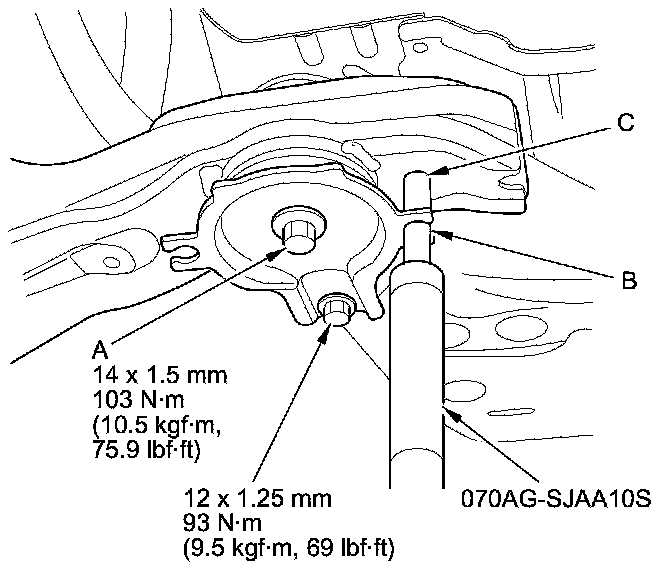27. Loosely tighten the front subframe mounting bolt (A) in the right rear stiffener until the front subframe insulator contacts the body; insert the subframe alignment pin (070AG-SJAA10S) through the positioning slot (B) on the right rear stiffener, through the positioning hole (C) on the front subframe, and into the positioning hole on the body.