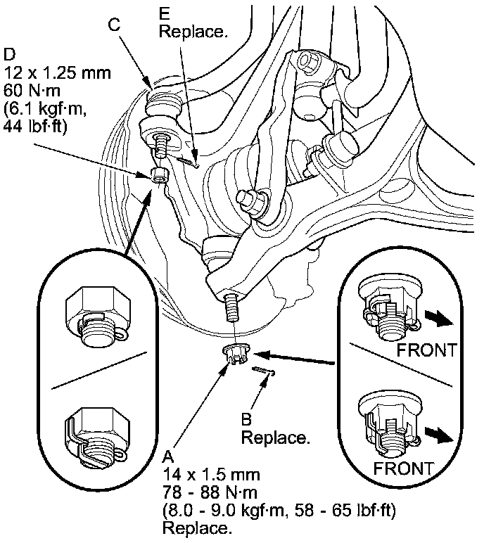 NOTE: Insert a new cotter pin (B) into the ball joint pin hole from the front to the rear of the vehicle, and bend its end as shown. Check the ball joint pin hole direction before connecting the ball joint.