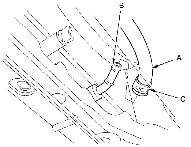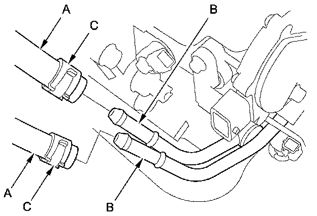 44. Connect the ATF cooler hose (A) to the ATF cooler line (B), and secure the hose with its clip (C) Service and Repair.