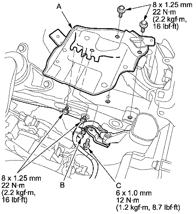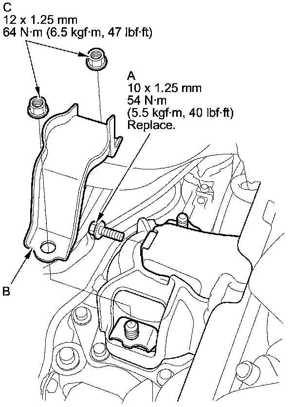 47. Install a new rear engine mount bolt (A), then install the rear engine mount stop (B) with the nuts (C).