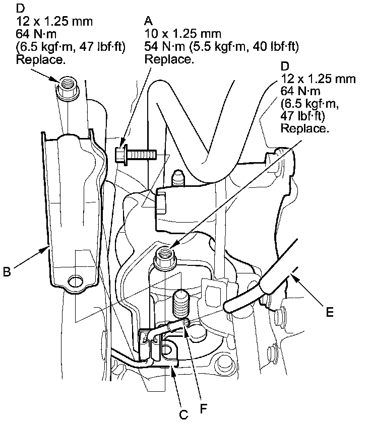 14. Loosely install new upper transmission mount bracket bolts (C) and nut (D) to the transmission housing.