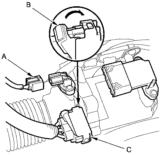 19. Connect the crankshaft position (CKP) sensor connector (A), and install the CKP sensor cover (B) and the sensor harness clamp bracket (C).
