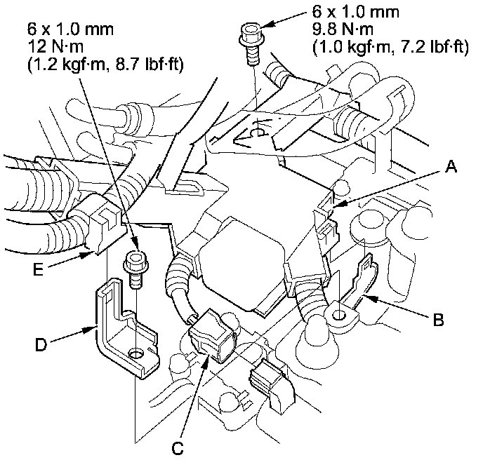 79. Connect PCM connectors A, B, and C, then install the PCM bracket with the bolts.