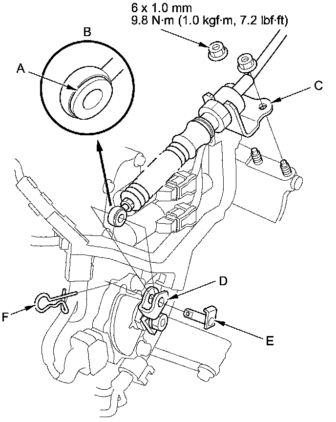 68. Apply molybdenum grease to the hole in the bushing (A) in the shift cable end (B), then install the shift cable bracket (C) with the nuts.