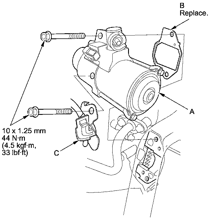 71. Install the starter (A) with a new gasket (B) and the harness clamp bracket (C).