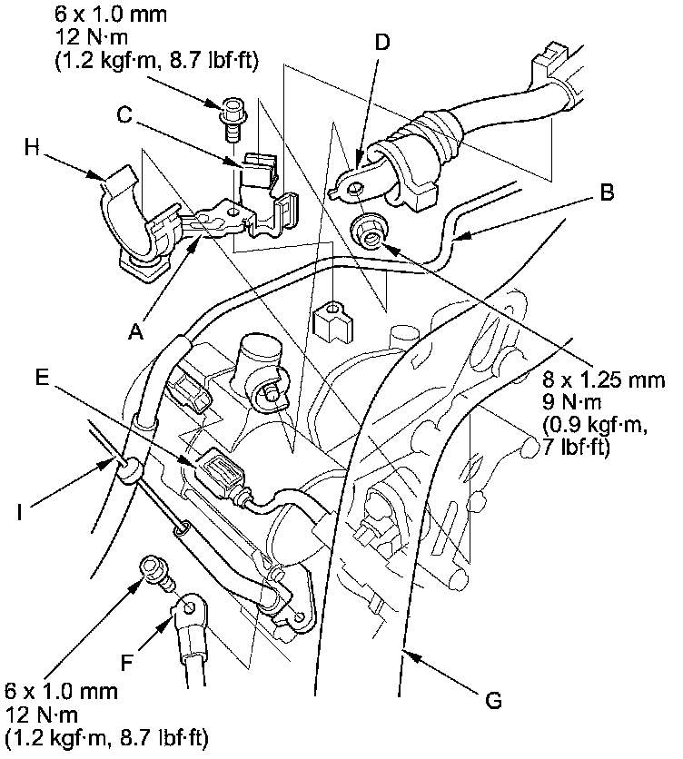 75. Install the transmission ground terminal (F), and install the lower radiator hose (G) in its clamp (H). Install the ATF dipstick (I).