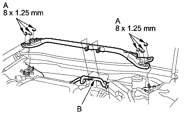 78. Install the vacuum hose (B) on the strut brace.