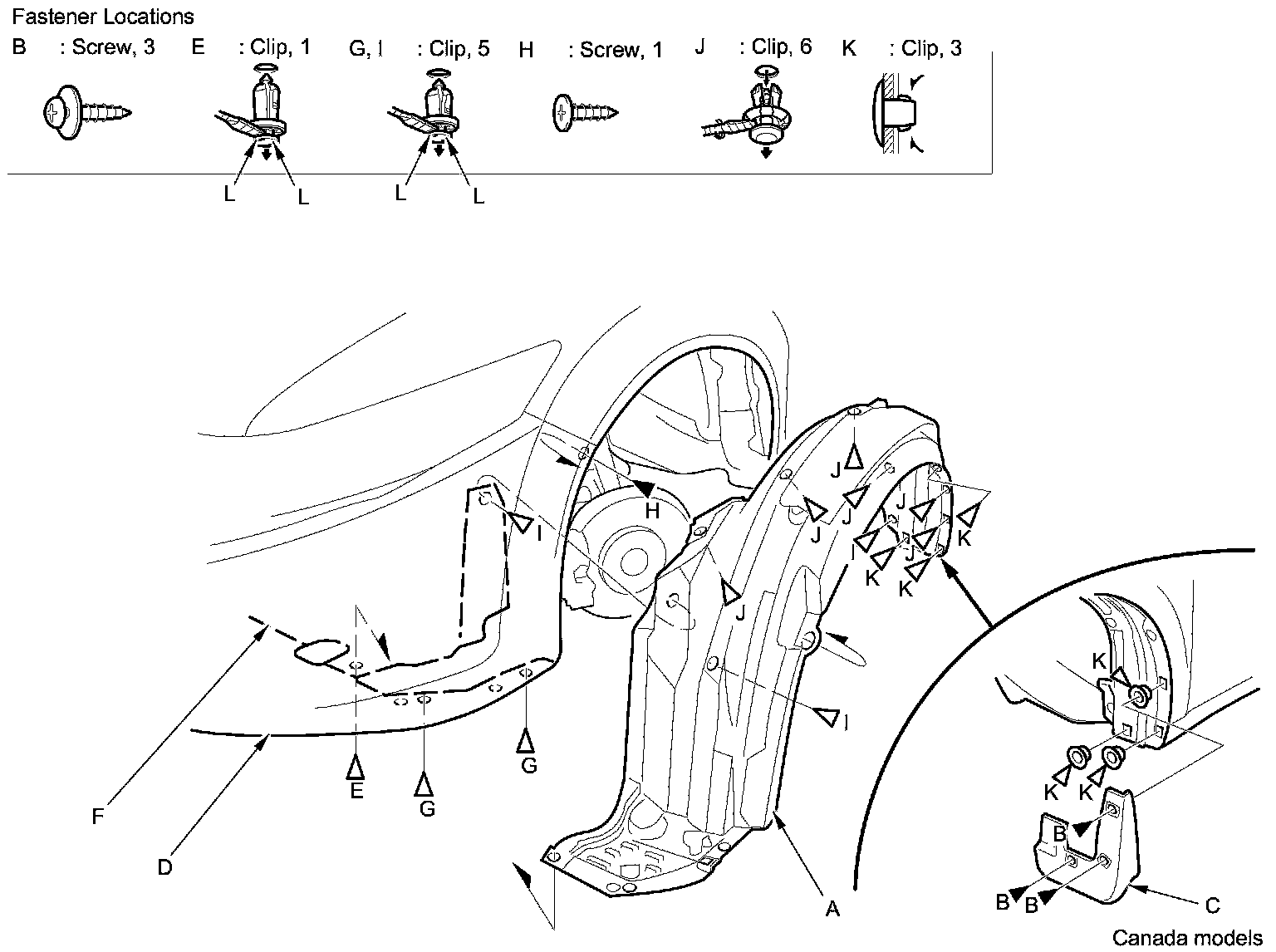 4. From the wheel arch, detach the clips (I, J, K) securing the front inner fender (and splash shield) to the body.