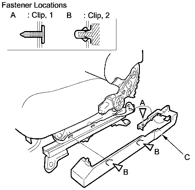 4. Detach the clips (A, B), then remove the upper rail outer cover (C).