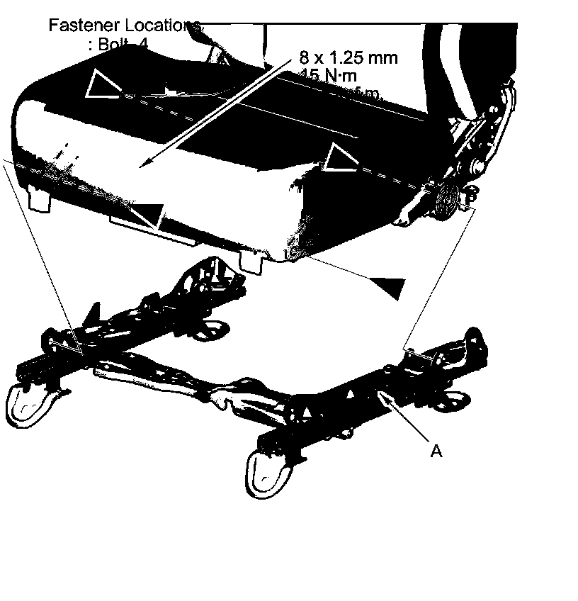 7. Remove the bolts with a TORX T30 bit, then remove the front seat rail (A).