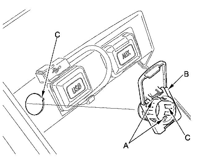 9. Gently press the tabs (A), then remove the housing (B) from the panel. Note the location of the indexing tabs (C).