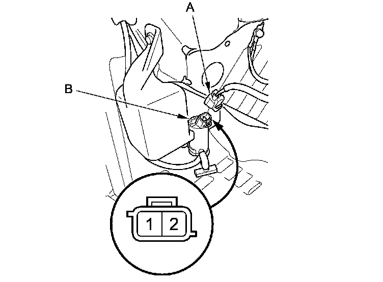2. Disconnect the 2P connector (A) from the windshield/rear window* washer motor (B).