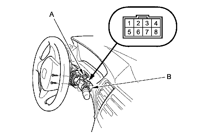 2. Disconnect the 8P connector (A) from the wiper/washer switch (B).