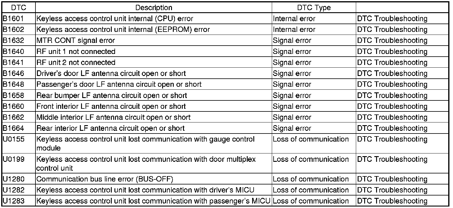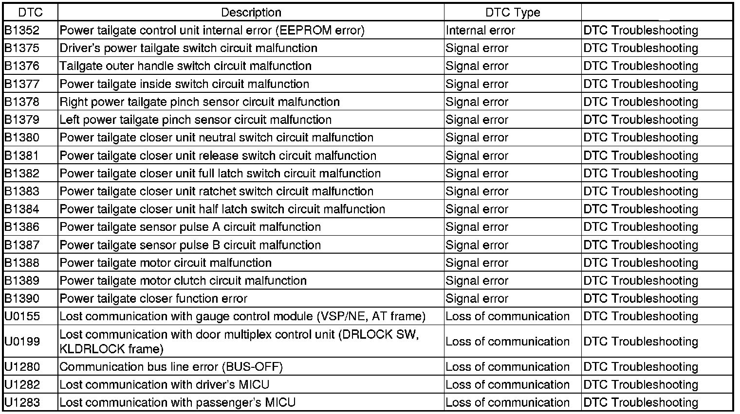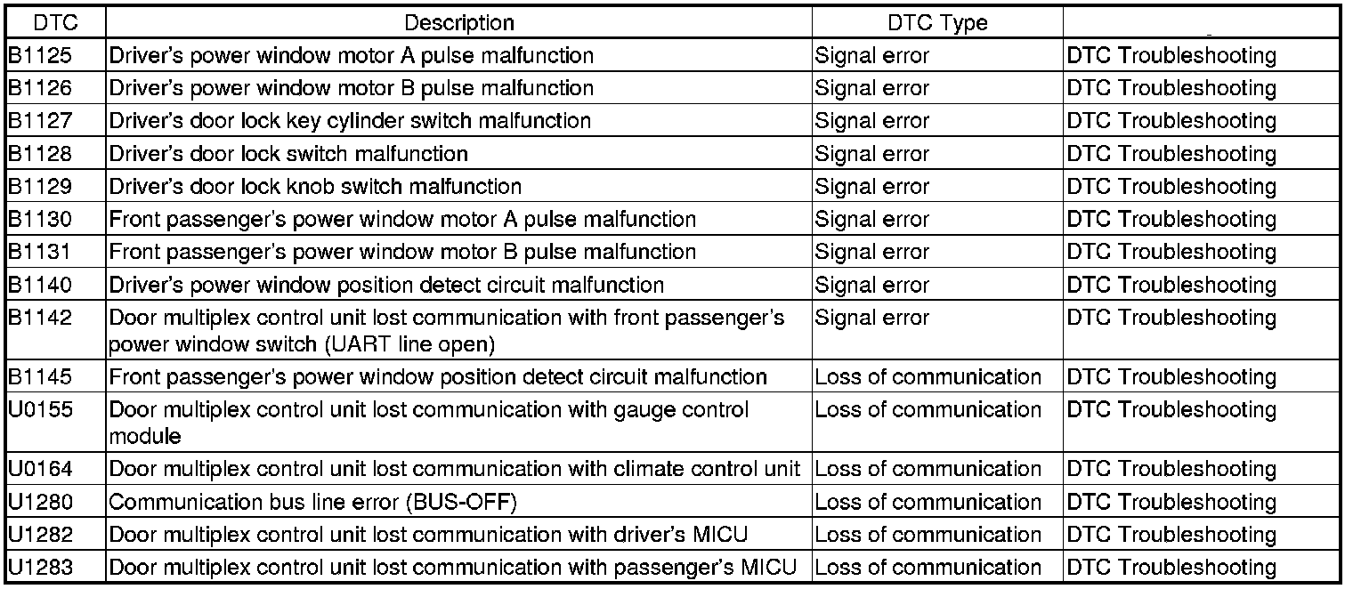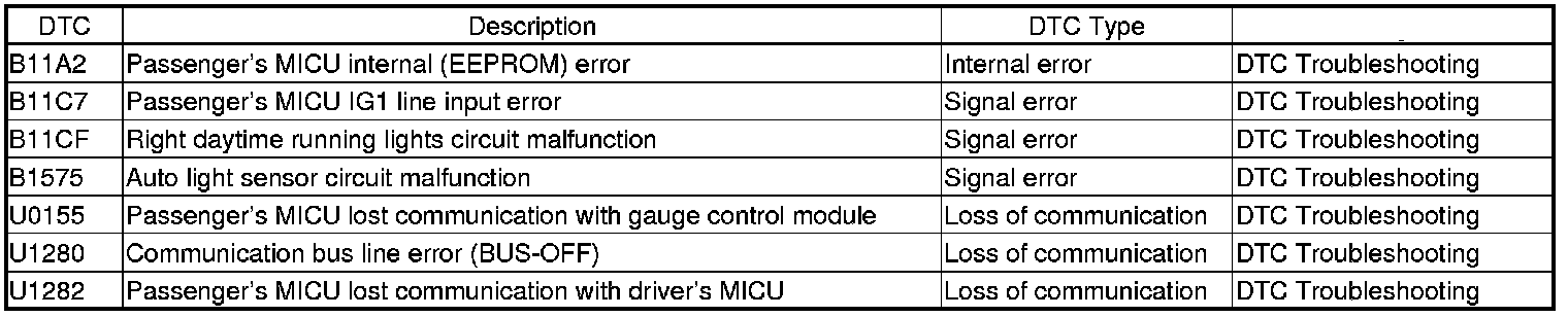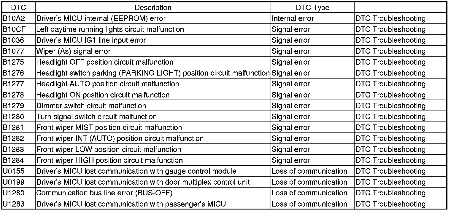 Multiplex Integrated Control System DTC Troubleshooting Index