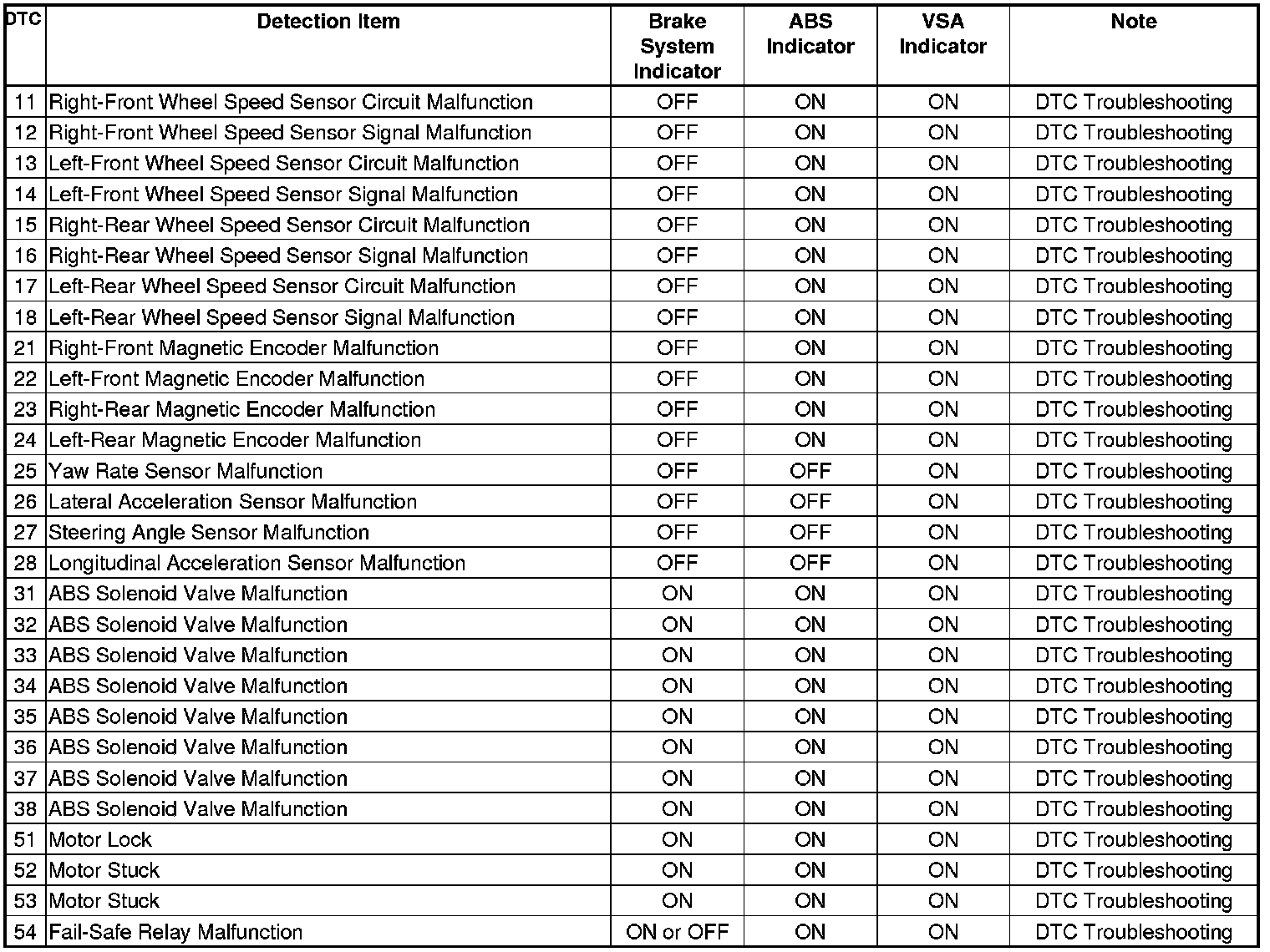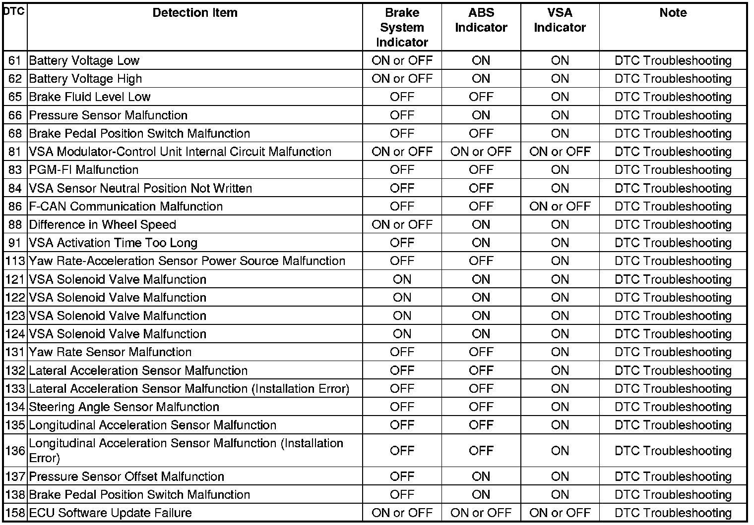 VSA System DTC Troubleshooting Index