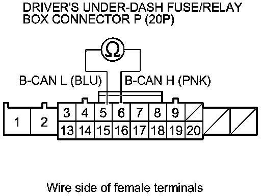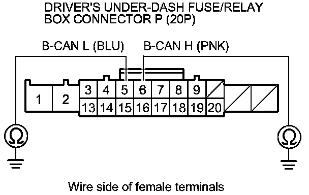 11. Check for continuity between body ground and driver's under-dash fuse/relay box connector P (20P) terminals No. 5 and No. 6 individually.