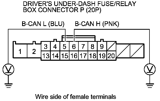 13. Measure the voltage between body ground and driver's under-dash fuse/relay box connector P (20P) terminals No. 5 and No. 6 individually.