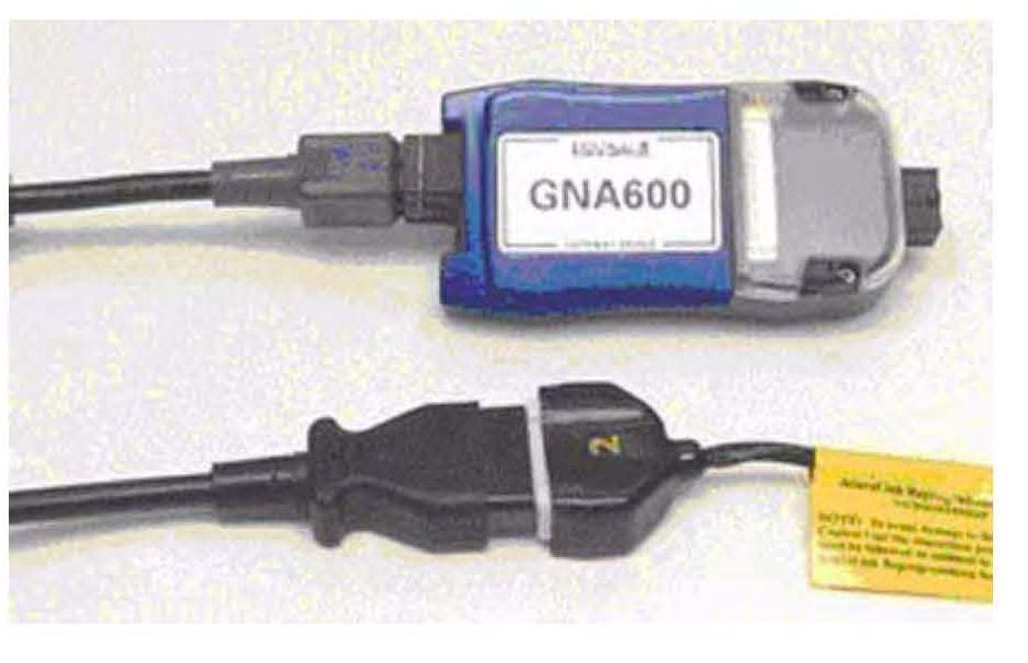 8. Connect the GNA600 unit to the power supply unit, and connect the power supply unit to an electrical outlet. The GNA600 unit starts a self-check, and after about 30 seconds, the LEDs on the GNA600 unit flash green and yellow. This indicates the GNA600 is ready to capture the current program ID on the vehicle.