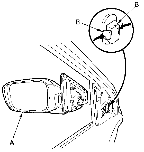 4. While holding the power mirror (A), squeeze the retaining tabs on the connector clips (B), then push out to remove the power mirror.