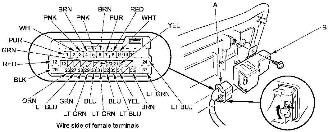 2. Disconnect the 37P connector (A) from the seat ventilation control unit (B).